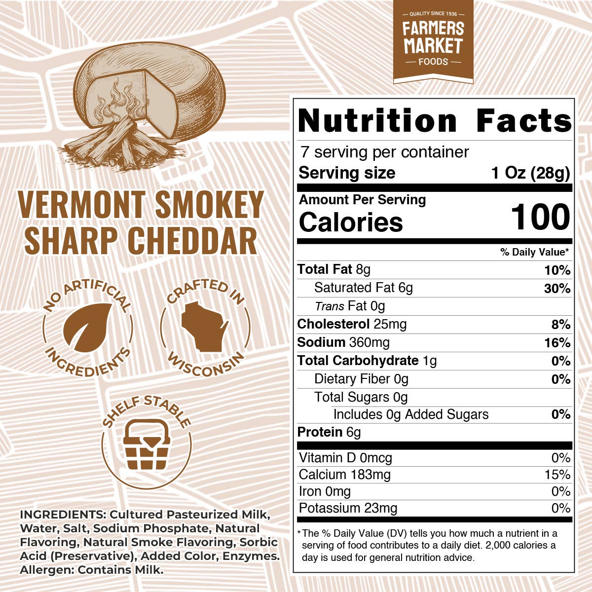 Farmers Market Foods Vermont Smokey Sharp Cheddar puts a smokey twist on a timeless classic. This 7oz block is artisan-crafted in Wisconsin using traditional small-batch methods, blending the sharp bite of aged Vermont cheddar with the smooth, natural richness of hardwood smoke. Perfect for charcuterie boards, holiday spreads, campfire gatherings, or everyday enjoyment, it’s bold, authentic cheddar with real character.