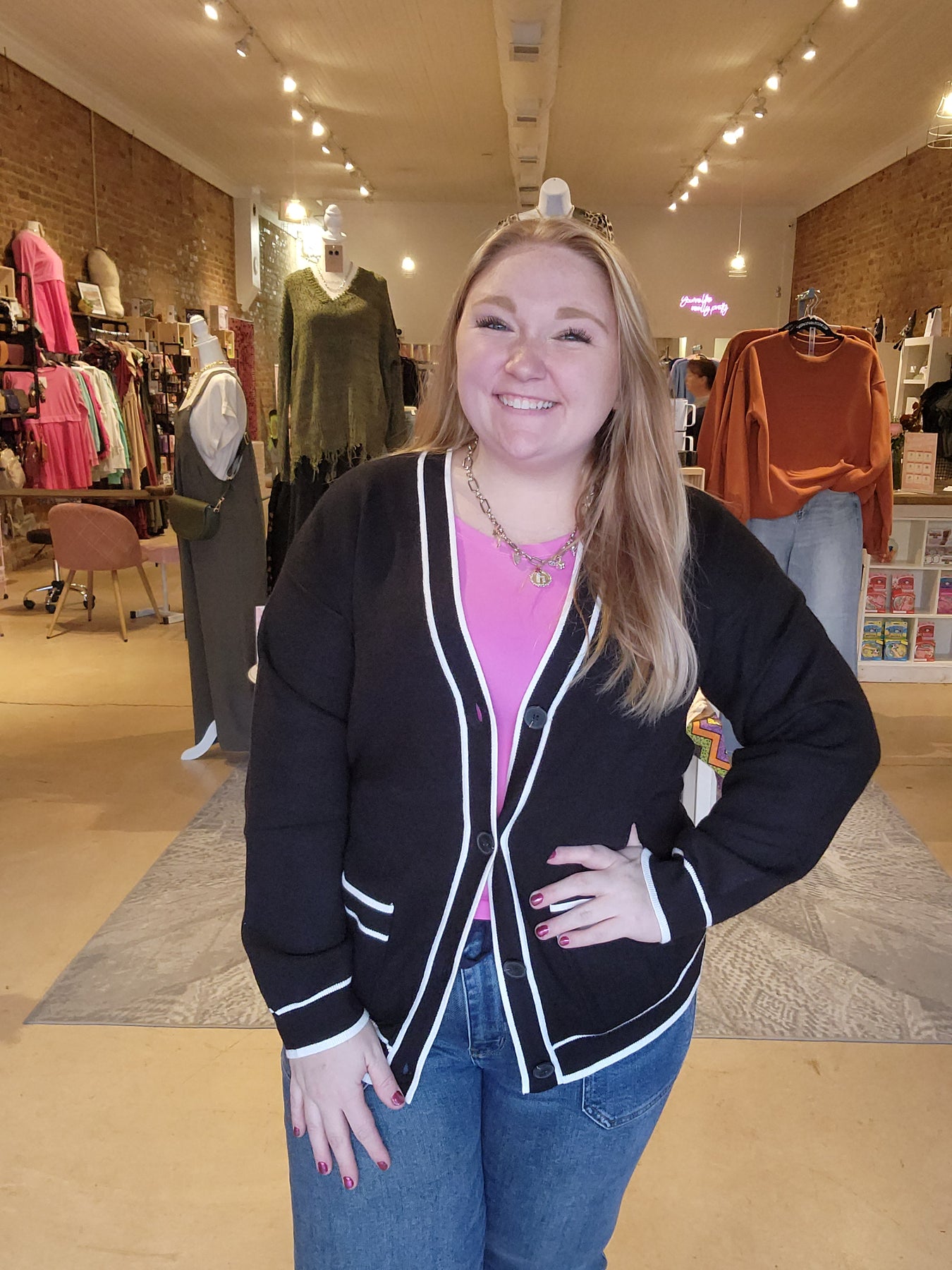 Stay cozy and cool in this Black Varsity Sweater! Crafted from high-quality knit fabric, it offers a perfect medium weight that keeps you comfy without overheating. Its timeless, classic design pairs effortlessly with any outfit, while the true-to-size, relaxed fit makes lounging or stepping out equally stylish. Your new go-to for effortless everyday charm!