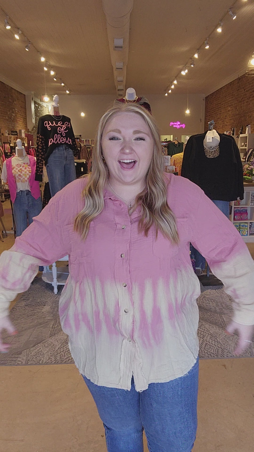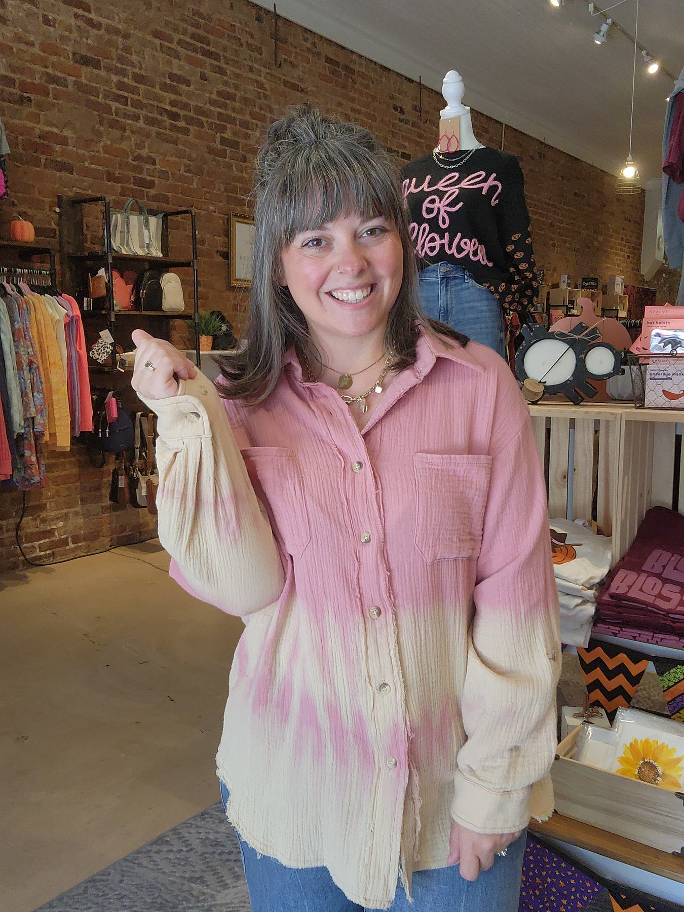This Pink Dip Dye Shacket is your go-to for layering with a splash of fun. Lightweight and breezy, it features playful buttons down the front and handy pockets to stash your little treasures. Perfect for those days when you want a pop of color without the weight!