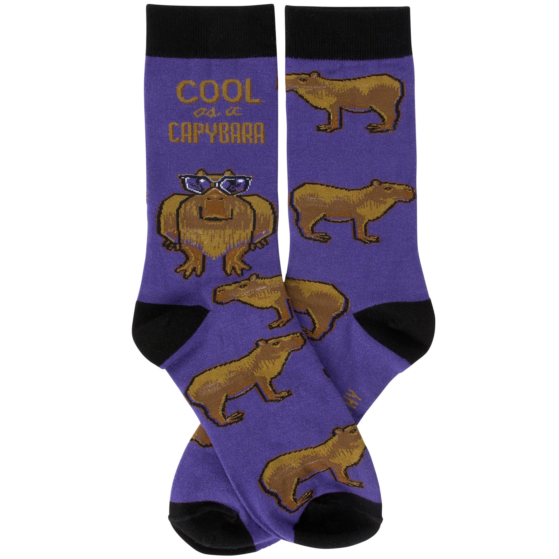 A pair of colorful socks from our LOL-Made You Smile Collection displaying a playful hand illustrated design of capybaras with one wearing sunglasses under a funny sentiment that reads "Cool As A Capybara." These giftable socks are made with a cotton, nylon, and spandex blend for a one size fits most design. Our Cool As A Capybara socks come with a decorative header card and a clear plastic hanger for easy rack display and gifting. A fun gift perfect for everyday self-expression.