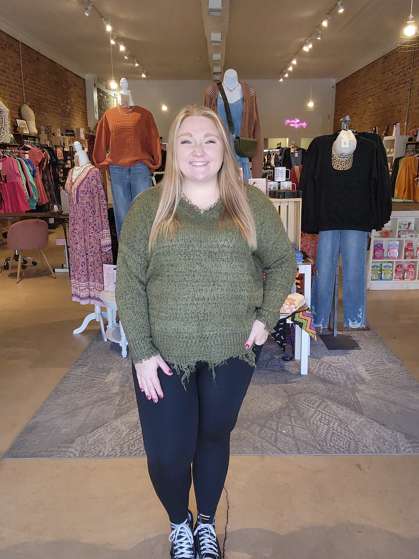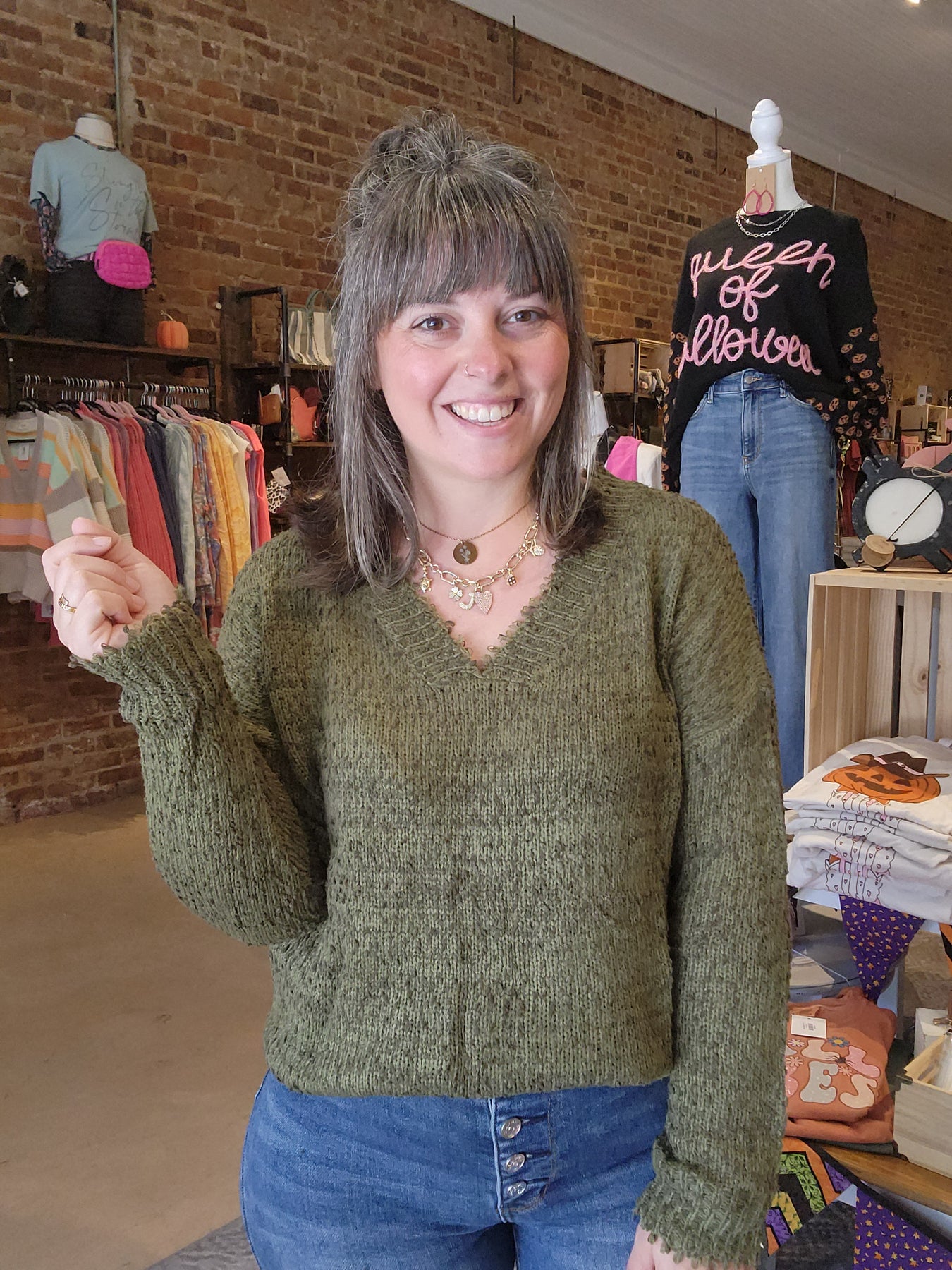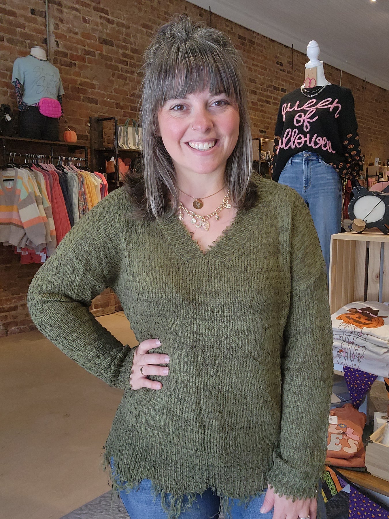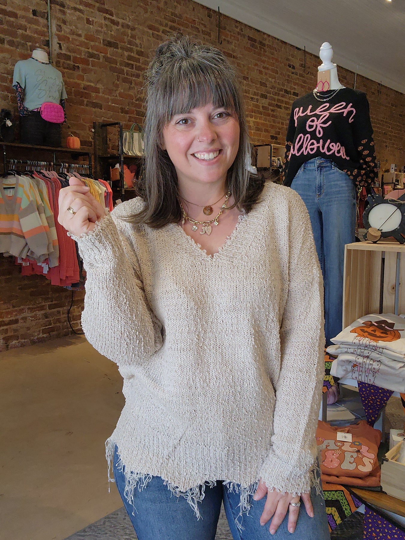 Embrace cozy comfort with a playful twist in this oversized Distressed Hem Sweater. Its lightweight, loose weave keeps you breezy, while the fun, uneven hemline adds a flirty edge. The deep V-neck invites layering or wearing solo for effortless style. Perfect for relaxed days when you want to stay snug without feeling weighed down.