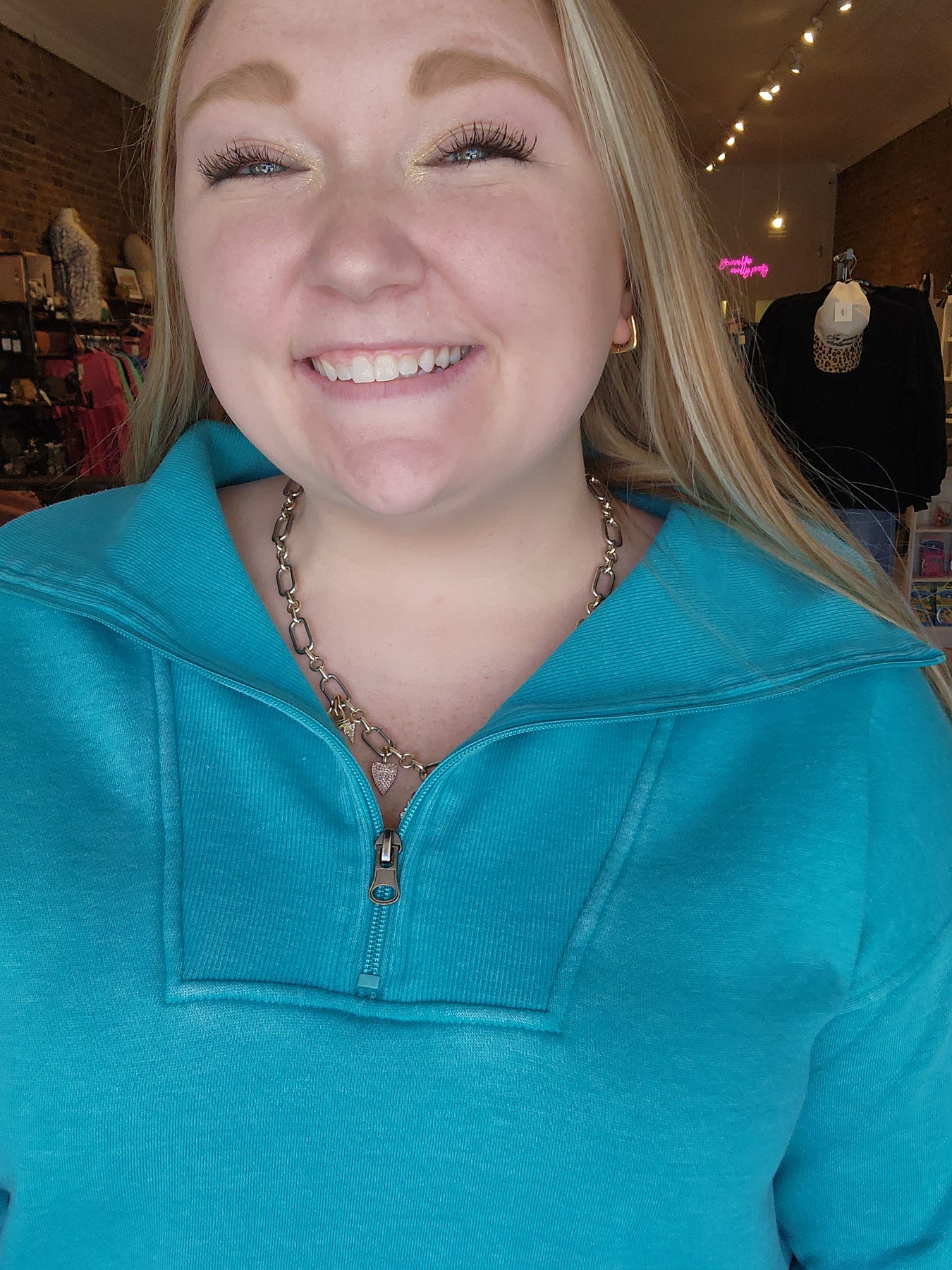 Snuggle up in the super cozy cottony feel of our Turquoise Quarter Zip. With a cute ribbed detail around the shimmering gold zipper, this top is the perfect blend of comfort and style. And don't worry about sizing, as it's designed to fit you just right.