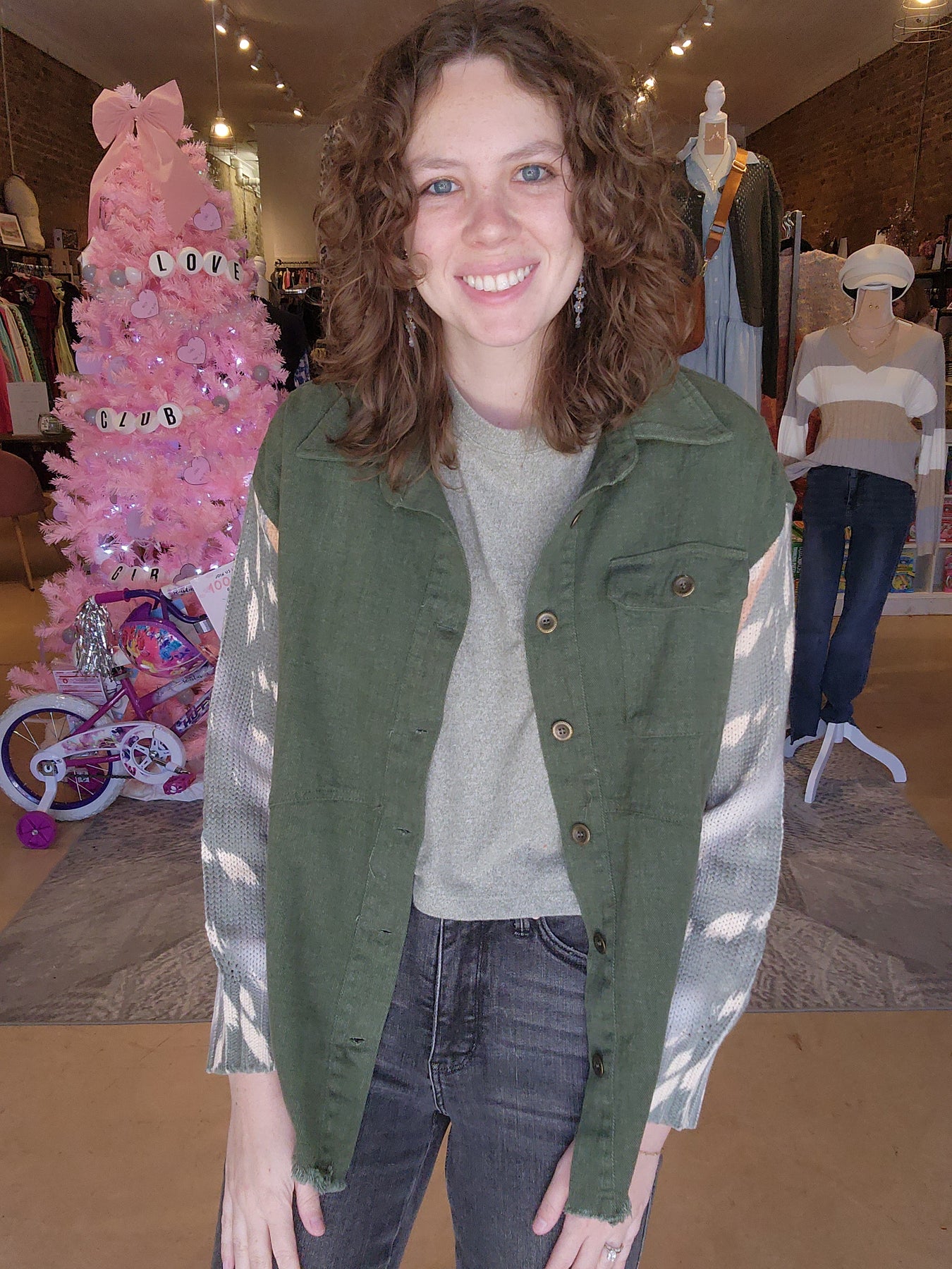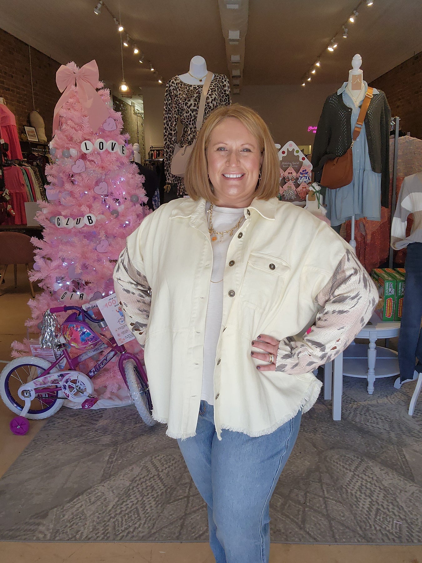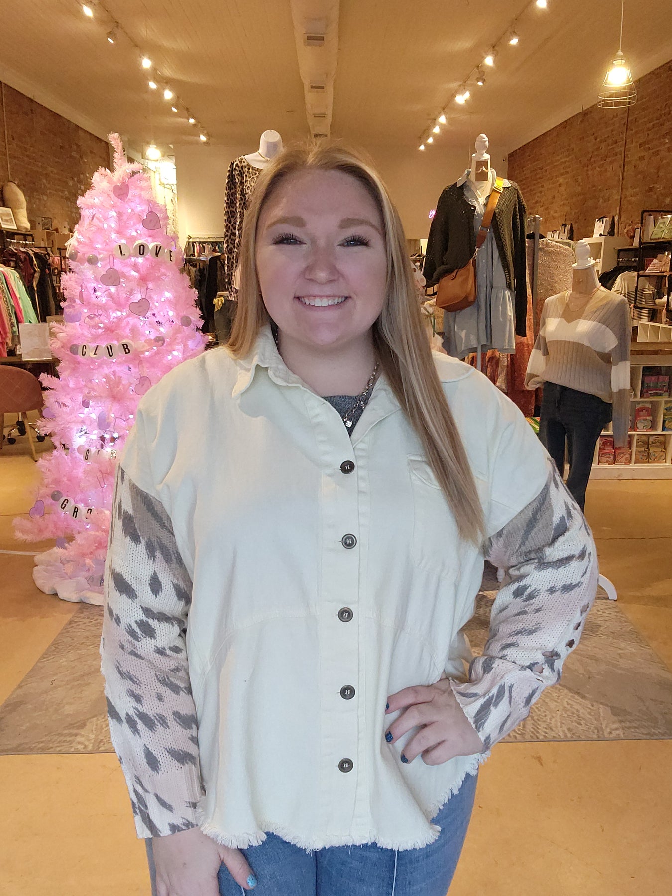 Mix classic denim with playful style in this charming shacket! Featuring a distressed denim body paired with cozy knit sleeves adorned in fun animal print, it's the perfect blend of edgy and whimsical. The neutral base keeps it versatile while the printed sleeves add personality to any outfit. True to size with a structured denim body for a polished fit. Layer it over your favorite tee or wear it solo for effortless cool-girl vibes.