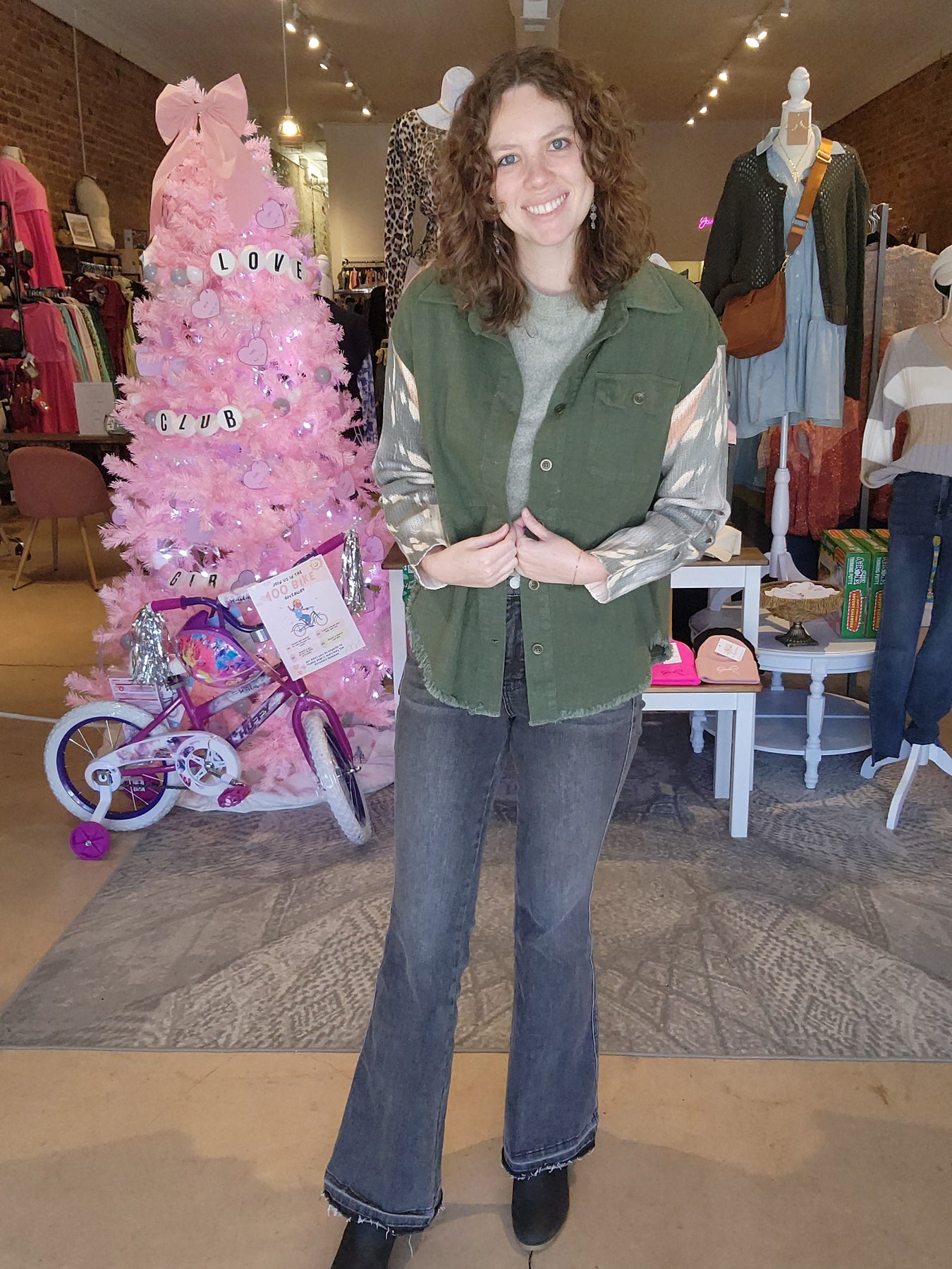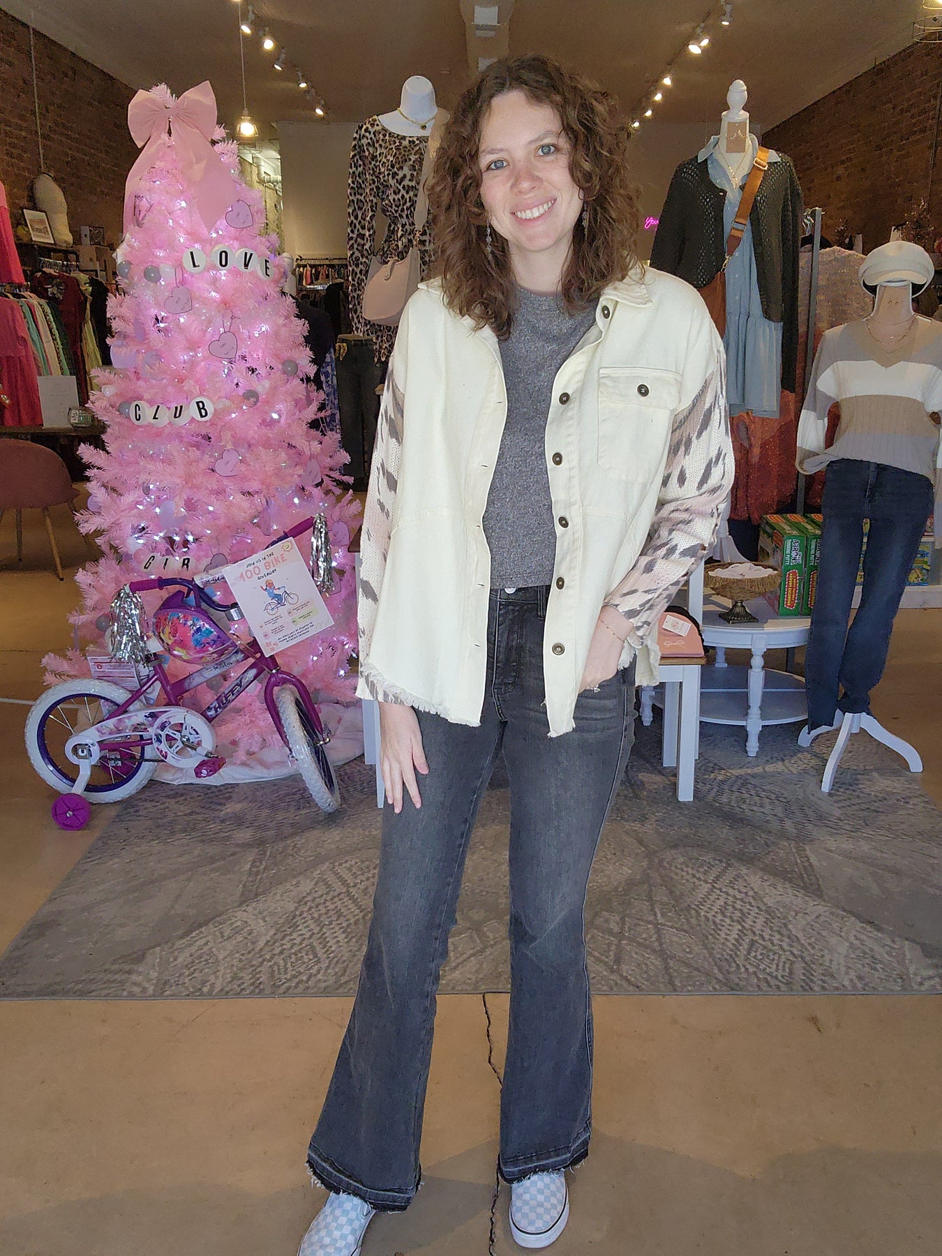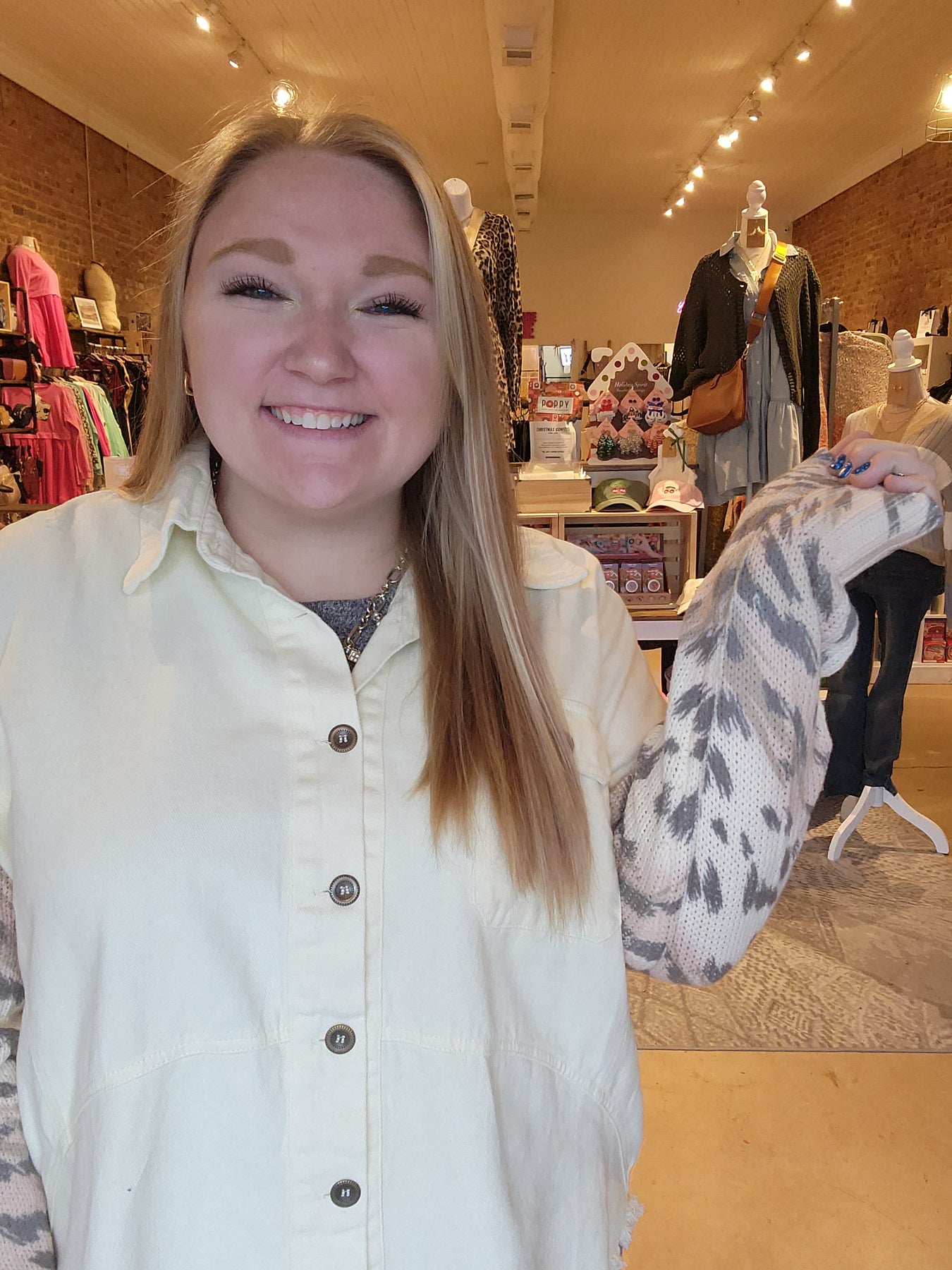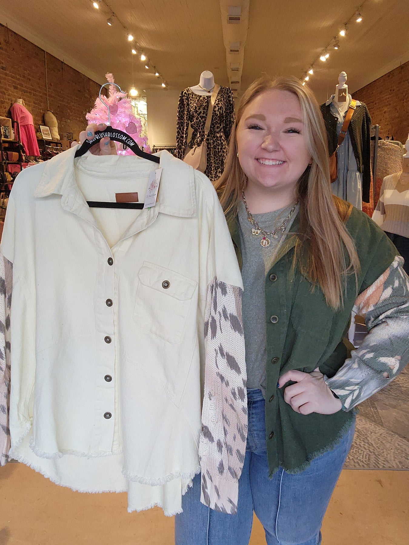 Mix classic denim with playful style in this charming shacket! Featuring a distressed denim body paired with cozy knit sleeves adorned in fun animal print, it's the perfect blend of edgy and whimsical. The neutral base keeps it versatile while the printed sleeves add personality to any outfit. True to size with a structured denim body for a polished fit. Layer it over your favorite tee or wear it solo for effortless cool-girl vibes.