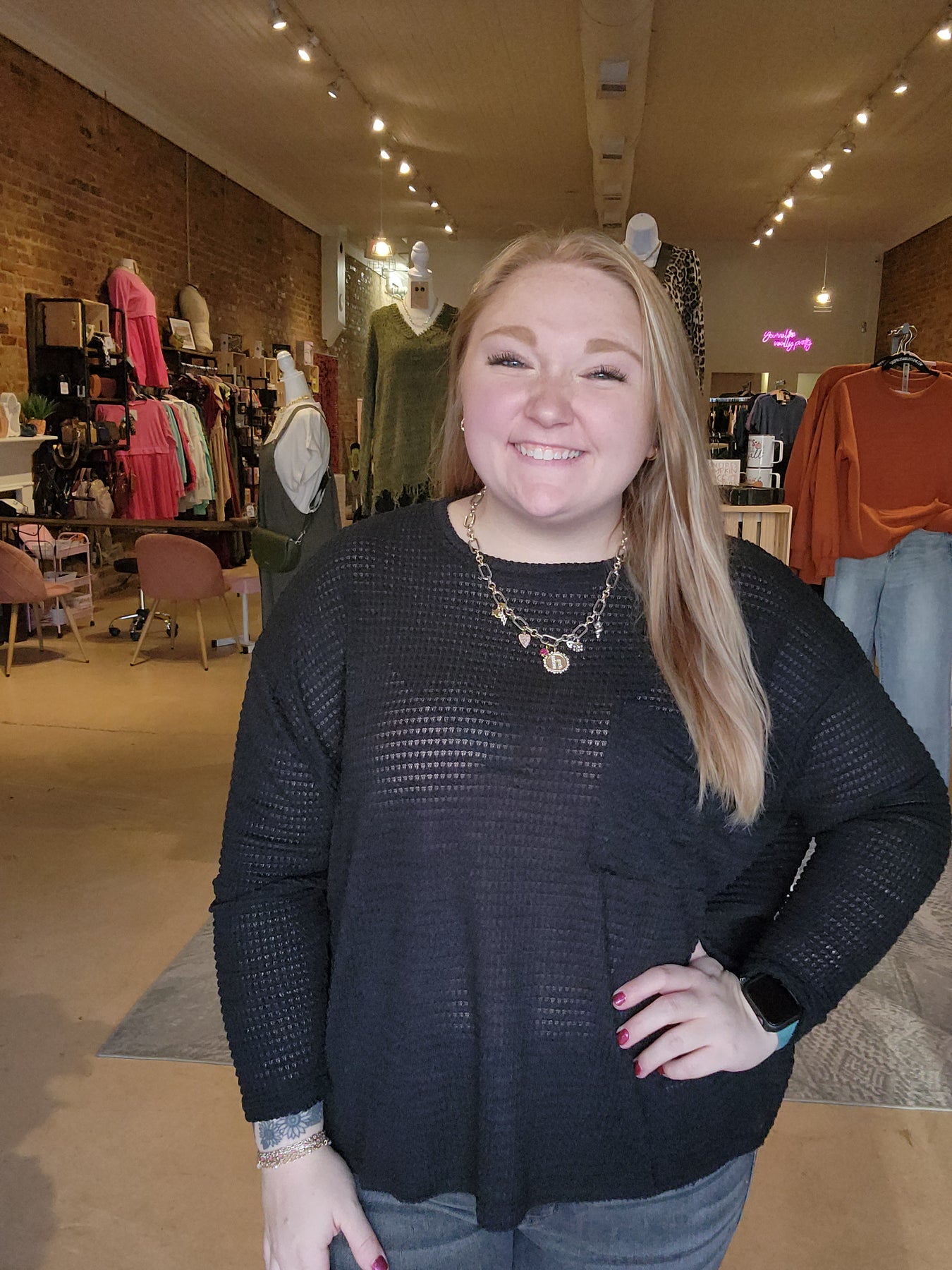 This Long Sleeve Waffle Front Pocket Top brings cozy vibes with a playful twist. Its open weave keeps things breezy and lightweight, perfect for layering or wearing solo. The boxy fit offers a relaxed silhouette, while stretchy arms let you move with ease and comfort all day long. Plus, a handy front pocket adds a quirky touch to this effortlessly cool staple.