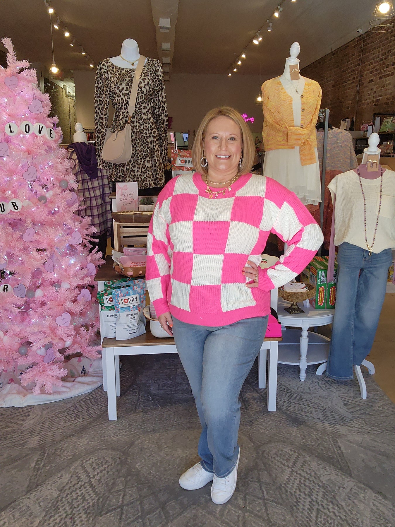 Brighten up those dreary days with this cheerful pink and white checkered sweater! Perfect for adding a fun pop of color when the season feels a little dull, this mid-weight knit keeps you cozy without the bulk. Cut roomy and true to size, it's designed for comfort and easy layering. Whether you're pairing it with jeans or dressing it up, this playful piece brings instant personality to your everyday wardrobe.